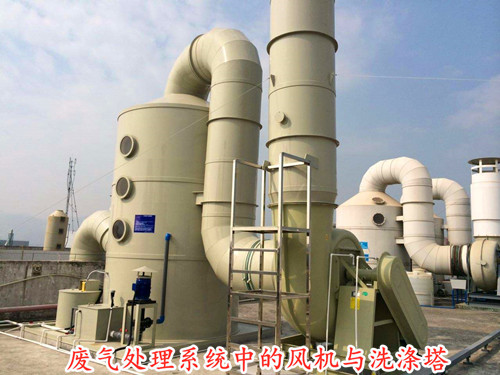 在前文有提到過洗滌塔的工作原理是廢氣由管道進入塔體底部,然后向上游走,經過一層層的噴淋凈化之后由塔體頂部的除霧裝置除霧,最后由玻璃鋼離心風機通過管道排至大氣環境中。