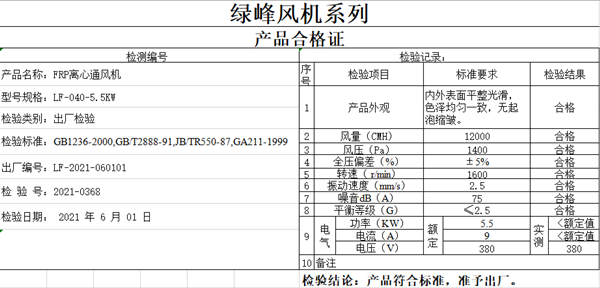 上面介紹的就是常規(guī)風(fēng)機(jī)合格證上面所記載的內(nèi)容,如果風(fēng)機(jī)為特殊類型在合格證上還需要加上一些特殊的檢測項(xiàng)目。如玻璃鋼阻燃風(fēng)機(jī),在檢測項(xiàng)目中需要加上阻燃性能測試。