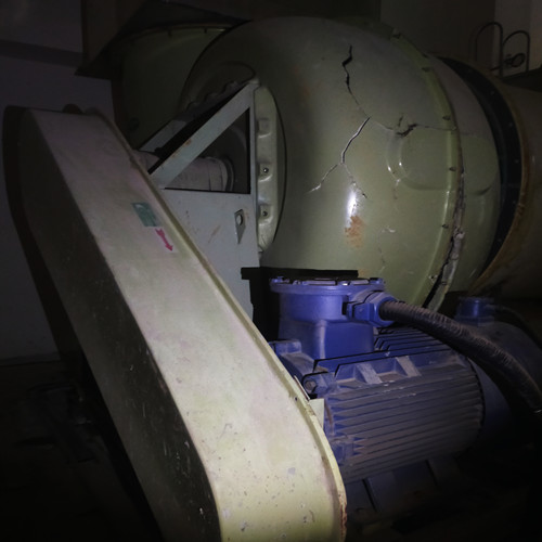 如下圖所示,玻璃鋼風(fēng)機的外殼以及內(nèi)部的葉輪都出現(xiàn)了嚴(yán)重的損壞,已經(jīng)無法修補,只能換新。而導(dǎo)致風(fēng)機損壞的主要原因是操作失誤,一段金屬角鋼在焊接管道時掉落,從風(fēng)管內(nèi)部進(jìn)入了風(fēng)機中。在風(fēng)機葉輪高速旋轉(zhuǎn)的作用下,導(dǎo)致外殼破裂以及葉輪的葉片出現(xiàn)大面積損壞。